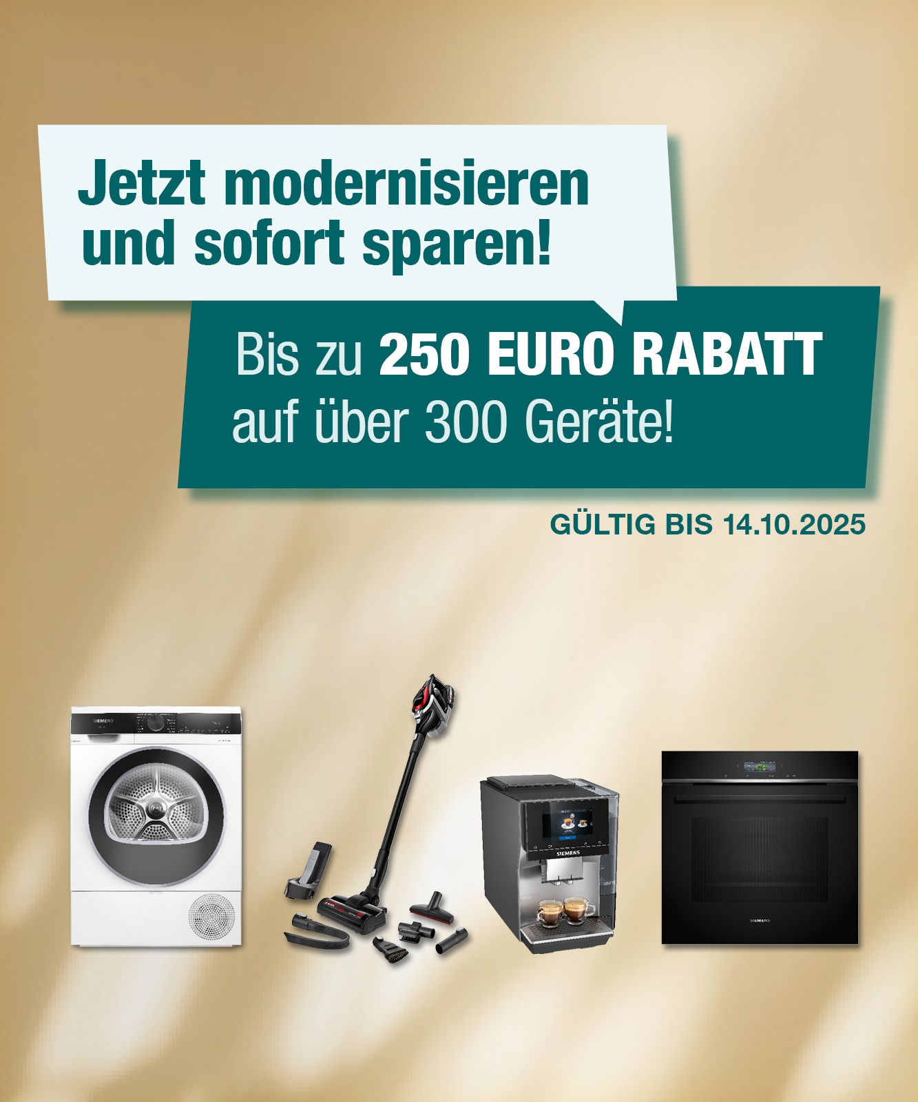 Energieeffizient, kostensparend und umweltfreundlich! Jetzt ist der perfekte Zeitpunkt, um alte Hausgeräte durch neuen zu ersetzen. Nutzen Sie unsere Sonderaktion vom 23.09. bis 14.10.2025 und sichern Sie sich bis zu 250 Euro Sofortrabatt. Entdecken Sie die besten Angebote und lassen Sie sich begeistern!